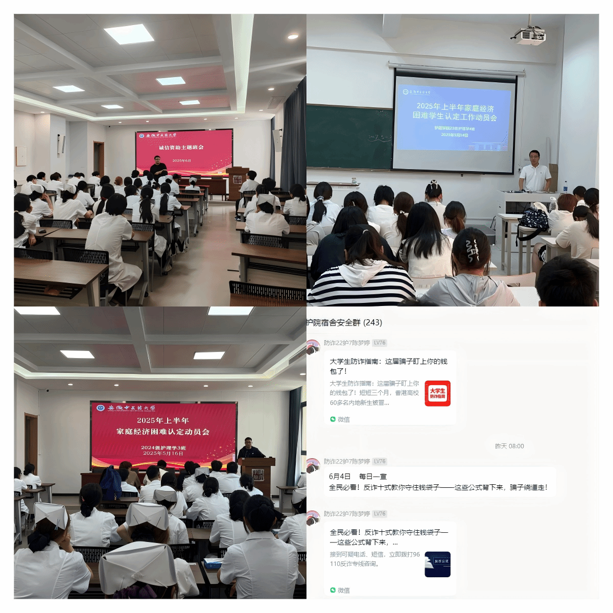 学院统筹部署,通过党委牵头、师生座谈等形式,全覆盖解读国家及学校资助政策,将诚信教育融入家庭经济困难认定全流程。各班级召开主题班会,针对家庭经济困难认定工作,引导诚实守信;创新搭建“学院 — 辅导员 — 防诈宣传员”网格化管理模式,以“每日一宣”推送防诈案例,筑牢资金安全防线。同时,组织学生参与学校“守住钱袋子・护好幸福家”短视频征集,培育科学消费观。