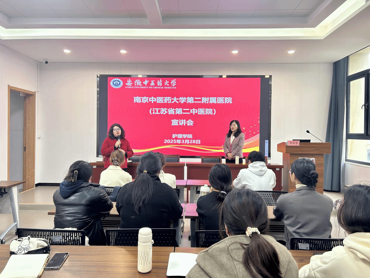 2025年3月28日,安徽中医药大学护理学院特邀南京中医药大学第二附属医院(江苏省第二中医院)开展专场宣讲会,为护理专业学子搭建就业与实习对接平台。