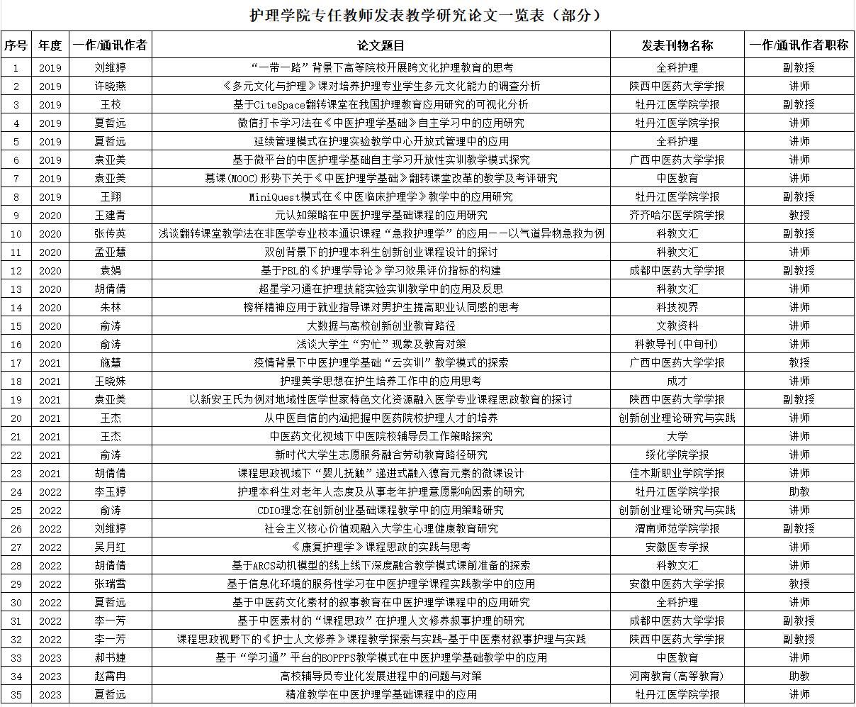 近年来,教师教学科研水平不断提高,主持省级教学科研项目40余项,共发表各类教研论文35余篇。同时学院鼓励教师要充分考虑各课程间联系与综合,以讲义为基础,以能力培养为主线,充分体现学生学习需要与循序渐进的原则,不断总结经验,编写体现护理专业特色的实践教材与指导书。目前学院教师积极开展教材建设,自2019年护理学院教师共参与教材编写33部,其中主编教材3部,副主编教材5部,参编教材25部,既创新了教学内容,又提高了教学质量,丰富了人才培养内涵。