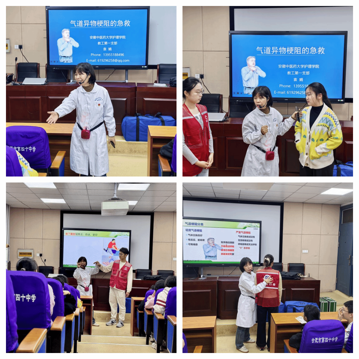 为普及实用急救知识、提升师生对应急突发事件的处置能力、筑牢校园安全防线,11月11日下午,安徽中医药大学护理学院教工第一党支部精准对接中小学安全教育需求,走进合肥市行知学校教育集团四十中分校,开展海姆立克急救法专题科普宣讲活动。