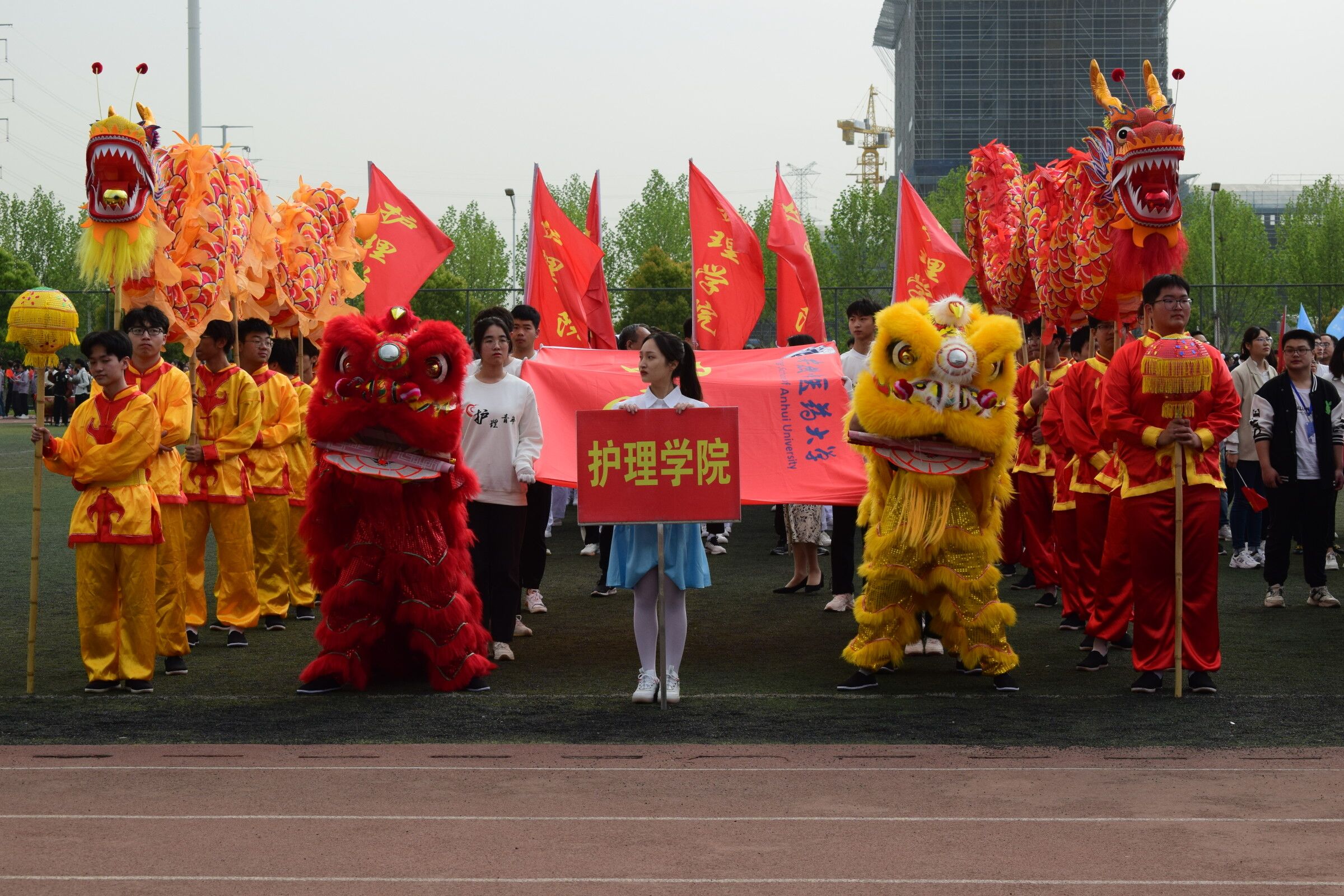 伴随着慷慨激昂的《运动员进行曲》,由各学院师生代表及相关部门代表组成的方阵队入场式拉开序幕。各代表队依次入场,他们穿着整齐的服装,喊着嘹亮的口号,迈着坚实的步伐,在引导员的带领下依次走过主席台接受检阅。正所谓“台上一分钟,台下十年功”,在主席台前,各个学院方阵队拿出看家本领,昔日的艰苦训练终于在今天化为一场别开生面的盛典,一展安中医学子的青春风采。红色跑道上,护理学院的舞龙舞狮小队踩乐点,巧配合,带动全场气氛。身后的方阵队同学们身着护士服,他们个个精神饱满、英姿飒爽,脸上灿烂的微笑写着他们的热情,嘹亮的口号体现着他们的“振兴中医药,争创双一流”的信心,他们走出了自信,走出了风采,充分展现了护院学子积极向上的风貌和团结拼搏的精神。