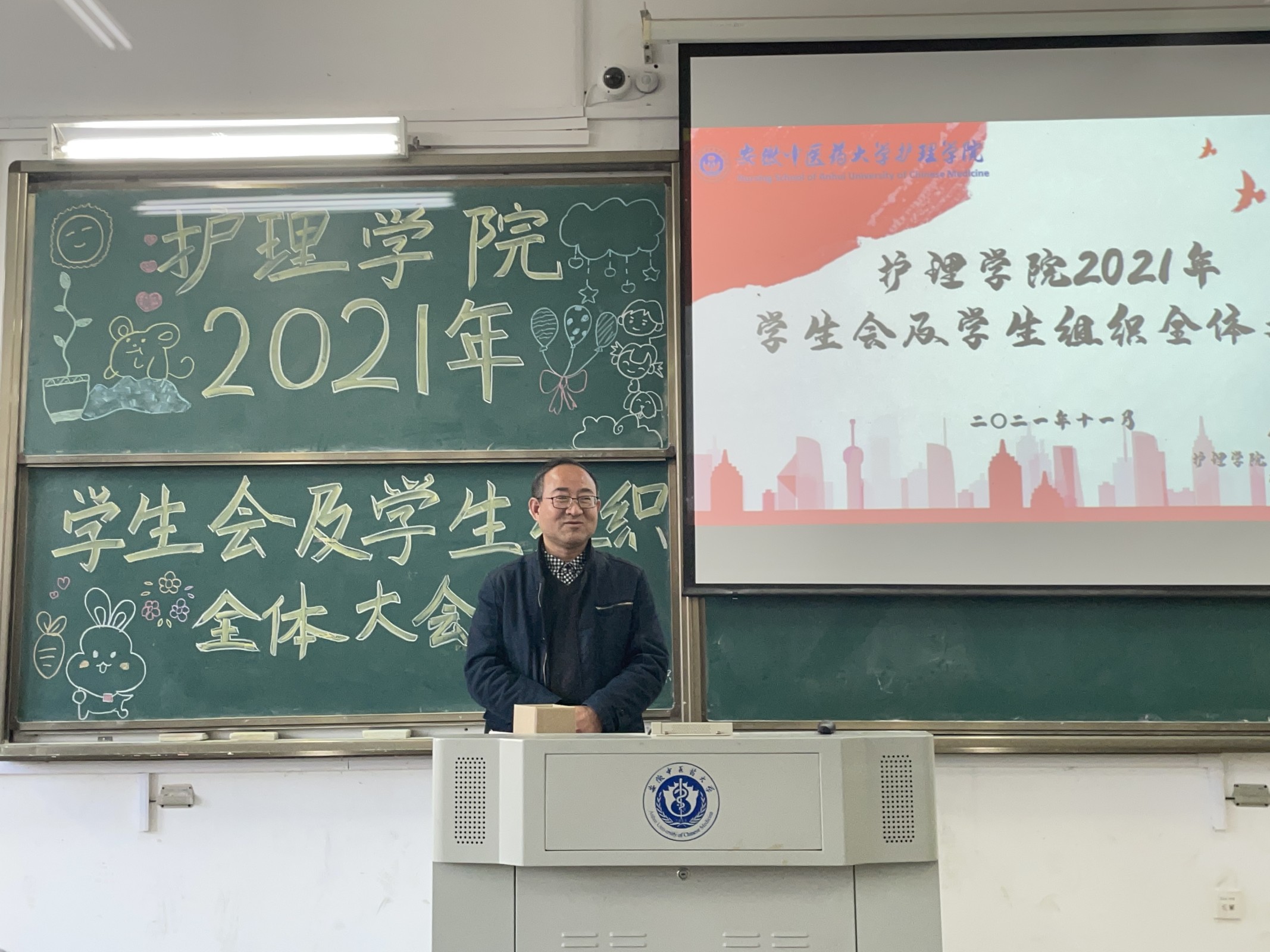 11月19日中午,护理学院2021年学生会及学生组织全体大会在公共教学楼A106举行。护理学院党委书记吴成长、院长颜贵明、党委副书记卞海、副院长张传英、分团委书记石玥以及各行政科室负责人、辅导员代表出席了大会。