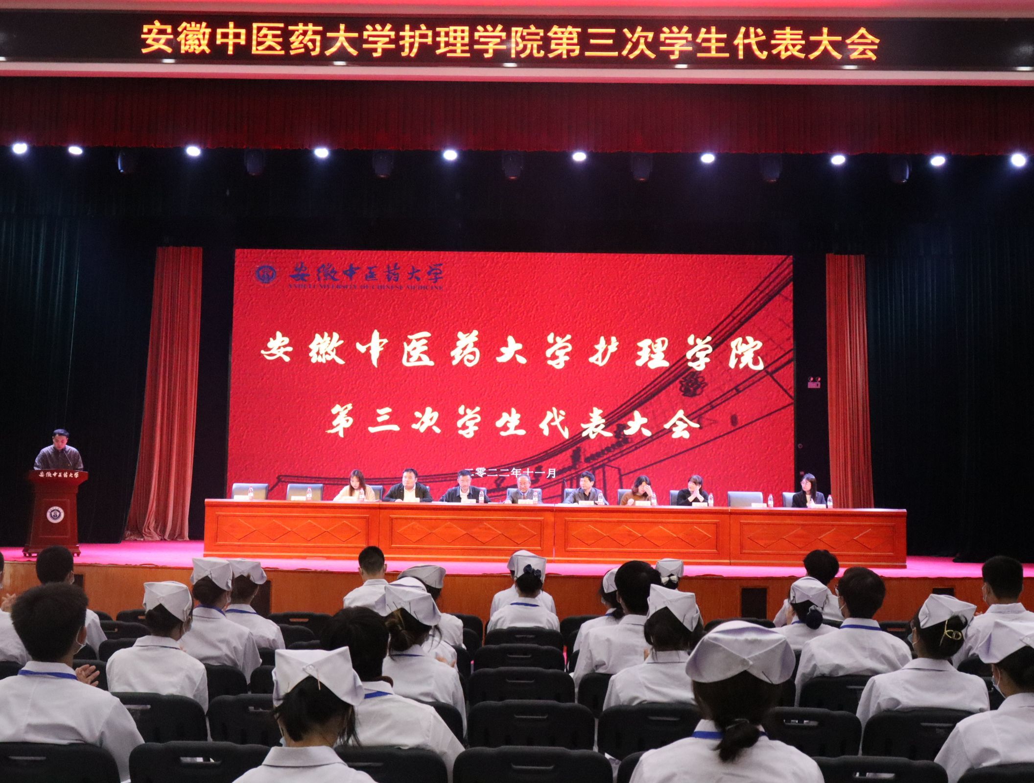 11月11日,安徽中医药大学护理学院第三次学生代表大会于大学生活动中心隆重召开,校团委副书记彭程,学院党委书记吴成长,学院院长颜贵明,学院党委副书记卞海,学院副院长张传英,学院基础护理系主任方海雁,学院学工办主任宋海洋,学院兼职分团委副书记王杰,学院辅导员代表石玥、赵霄冉出席了本次大会的开幕式。大会由分团委书记俞涛主持,94名学生代表参会。