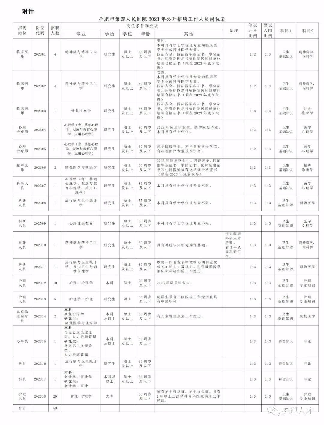 本次招聘工作人员58名,具体条件见《合肥市第四人民医院2023年公开招聘工作人员岗位表》(见附件)。招聘对象为国家承认学历的毕业生符合招聘岗位条件者,且必须符合以下条件:
