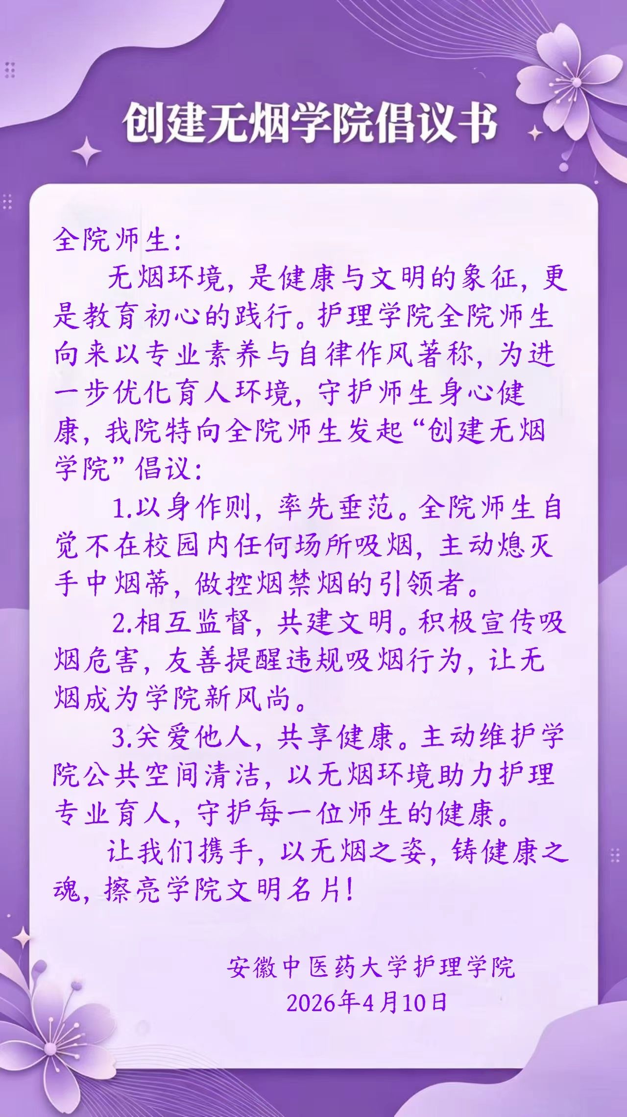 为深入践行健康校园建设理念,进一步优化育人环境,切实守护全院师生身心健康,4月10日,护理学院面向全院师生正式发起“无烟学院”创建倡议,以实际行动凝聚共识、传递力量,全力打造文明、清新、安全、健康的育人空间。